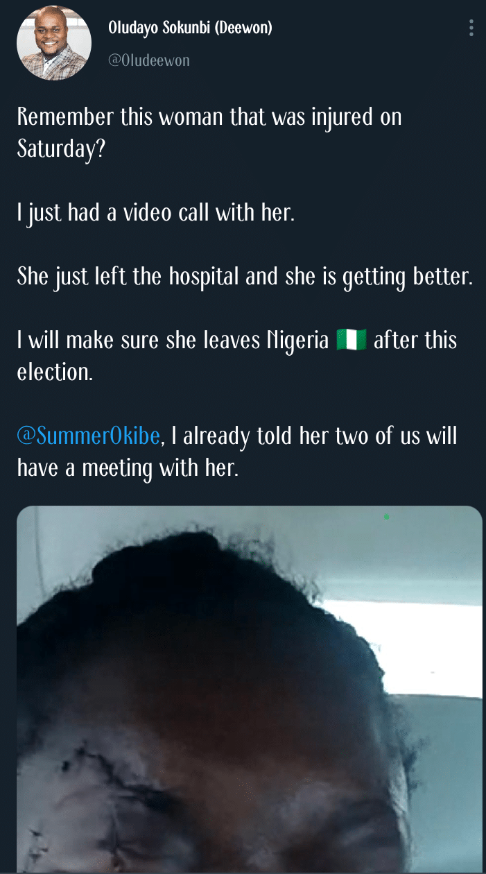 “Remember this woman that was injured on Saturday? I just had a video call with her. She just left the hospital and she is getting better. I will make sure she leaves Nigeria 🇳🇬 after this election.”