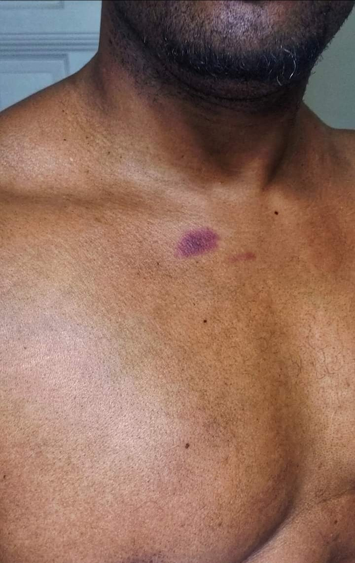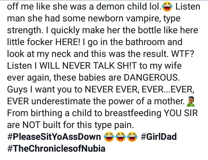 I’m like WTF I’m trying to pull her off me like… fck, fck get off me! I wanted to toss her off me like she was a demon child lol. Listen man she had some newborn vampire, type strength. I quickly make her the bottle like here little focker HERE! I go in the bathroom and look at my neck and this was the result. WTF? Listen I WILL NEVER TALK SH!T to my wife ever again, these babies are DANGEROUS. Guys I want you to NEVER EVER, EVER…EVER, EVER underestimate the power of a mother. From birthing a child to breastfeeding YOU SIR are NOT built for this type pain. #PleaseSitYoAssDown #GirlDad #TheChroniclesofNubia