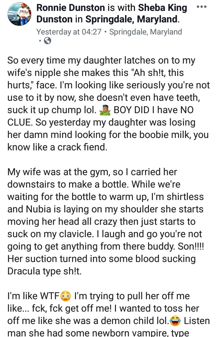 My wife was at the gym, so I carried her downstairs to make a bottle. While we’re waiting for the bottle to warm up, I’m shirtless and Nubia is laying on my shoulder she starts moving her head all crazy then just starts to suck on my clavicle. I laugh and go you’re not going to get anything from there buddy. Son!!!! Her suction turned into some blood sucking Dracula type sh!t.