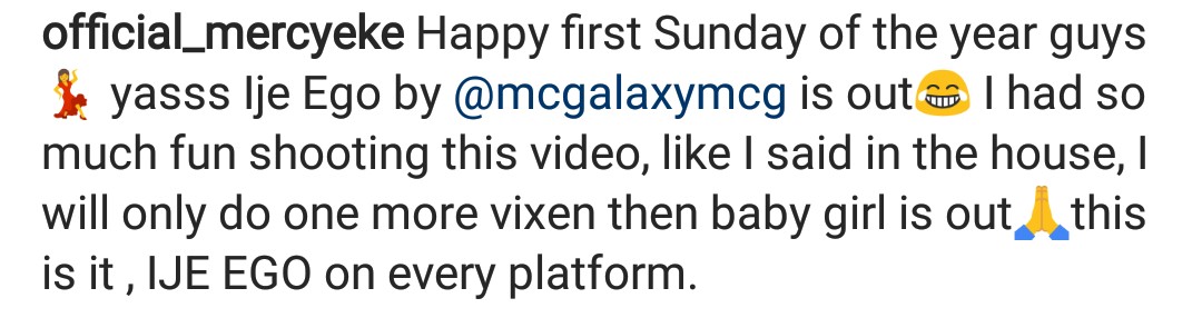 “Happy first Sunday of the year guys yasss Ije Ego by @mcgalaxymcg is out I had so much fun shooting this video, like I said in the house, I will only do one more vixen then baby girl is out this is it , IJE EGO on every platform.”