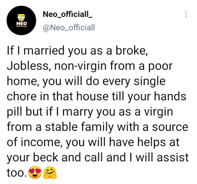 “If I married you as a broke, Jobless, non-virgin from a poor home, you will do every single chore in that house till your hands pill but if I marry you as a virgin from a stable family with a source of income, you will have helps at your beck and call and I will assist too.??”