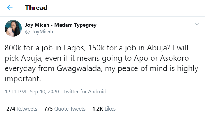 “800k for a job in Lagos, 150k for a job in Abuja? I will pick Abuja, even if it means going to Apo or Asokoro everyday from Gwagwalada, my peace of mind is highly important.” she wrote on Twitter.