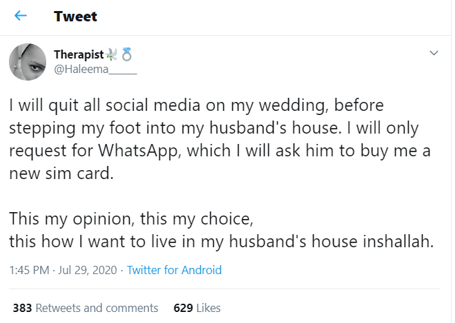 “I will quit all social media on my wedding, before stepping my foot into my husband’s house. I will only request for WhatsApp, which I will ask him to buy me a new sim card.