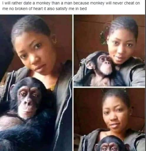“I will rather date a monkey than a man, because monkey will never cheat on me,no broken heart,it also satisfy me in bed”