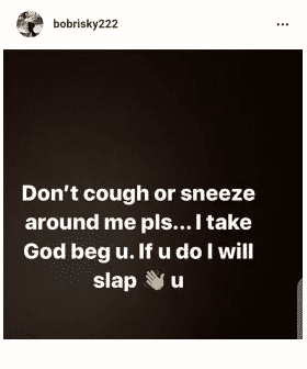 He wrote: “Don’t cough or sneeze around me pls. I take God beg you. If you do I will slap you.”