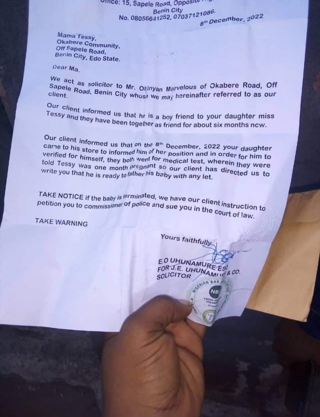 “I will sue you if this baby is terminated” – Benin man sends written notice to pregnant girlfriend’s mother