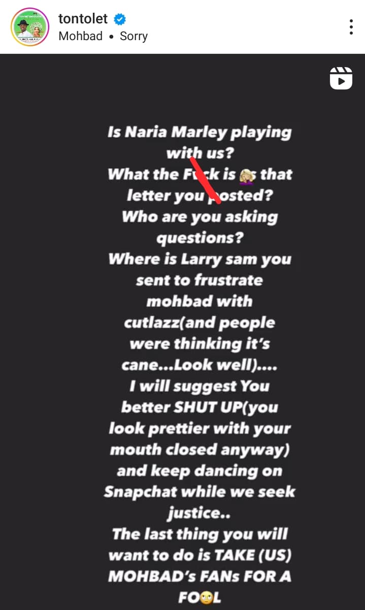 What the Fk is that letter you posted? Who are you asking questions? Where is Larry sam you sent to frustrate mohbad with cutlazz(and people were thinking it’s cane…Look well)… I will suggest You better SHUT UP(you look prettier with your mouth closed anyway) and keep dancing on Snapchat while we seek justice..