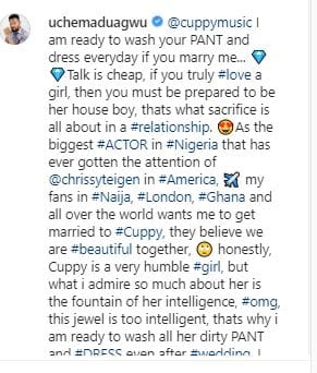 “@cuppymusic I am ready to wash your PANT and dress everyday if you marry me… Talk is cheap, if you truly #love a girl, then you must be prepared to be her house boy, thats what sacrifice is all about in a #relationship. As the biggest #ACTOR in #Nigeria that has ever gotten the attention of @chrissyteigen in #America, my fans in #Naija, #London, #Ghana and all over the world wants me to get married to #Cuppy, they believe we are #beautiful together, honestly, Cuppy is a very humble #girl, but what i admire so much about her is the fountain of her intelligence, #omg, this jewel is too intelligent, thats why i am ready to wash all her dirty PANT and #DRESS even after #wedding.