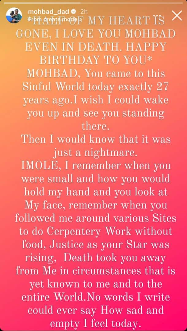 On his Instagram story post, he continued, “MY HEART GONE, I LOVE YOU MOHBAD EVEN IN DEATH. HAPPY BIRTHDAY TO YOU* MOHBAD, You came to this Sinful World today exactly 27 years ago. I wish I could wake you up and see you standing there.
