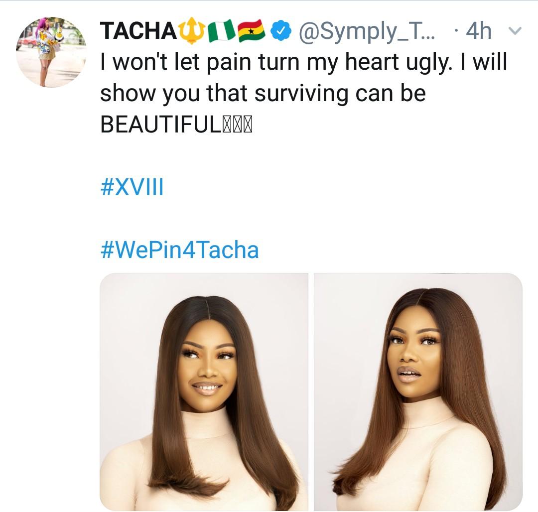 According to Tacha, she decided not to allow her pain affect her actions and make her heart “bitter”. Rather, she has chosen to show people how beautiful it can be to survive pain.