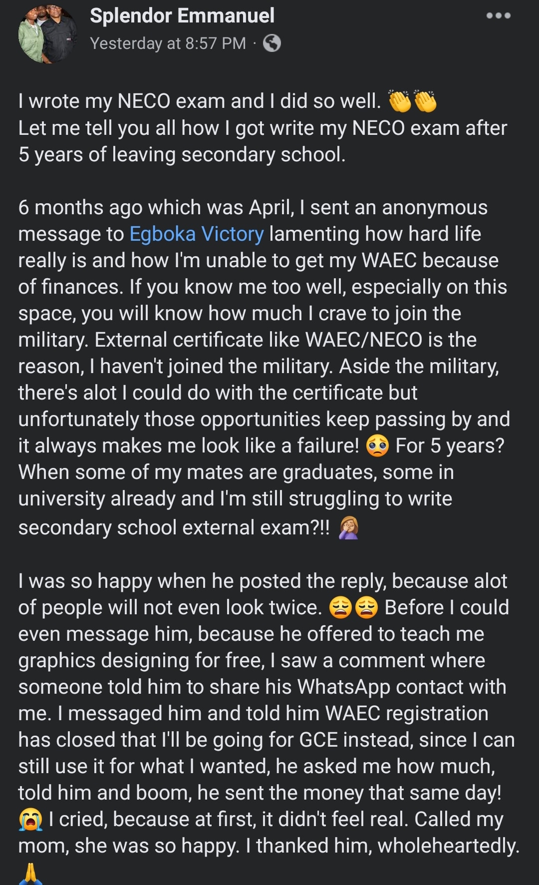 “6 months ago which was April, I sent an anonymous message to Egboka Victory lamenting how hard life really is and how I’m unable to get my WAEC because of finances. If you know me too well, especially on this space, you will know how much I crave to join the military.”
