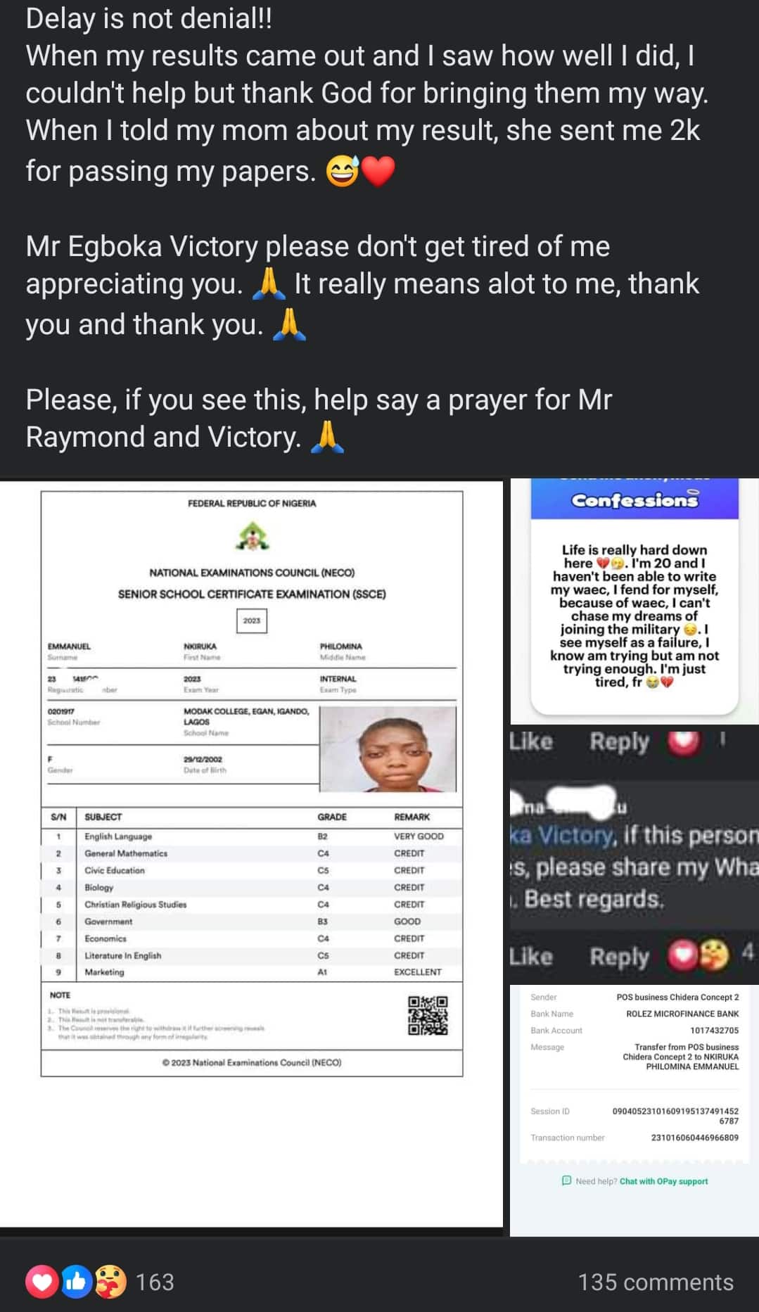 “Delay is not denial!! When my results came out and I saw how well I did, I couldn’t help but thank God for bringing them my way. When I told my mom about my result, she sent me 2k for passing my papers.”