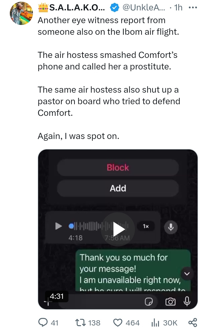 An audio detailing this was shared by the X user, @UnkleAyo who opined that the air hostess was being manipulative.