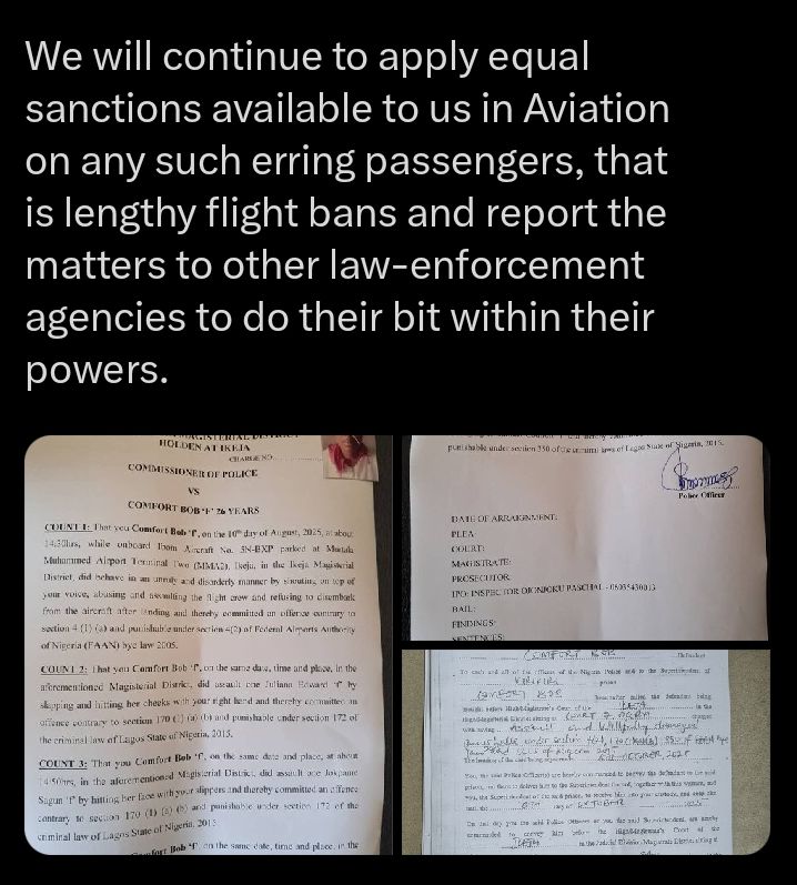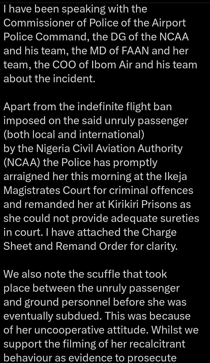According to Keyamo, Emmanson has been banned indefinitely from flying by the Nigeria Civil Aviation Authority (NCAA), charged to court, and remanded in Kirikiri Prison for failing to provide adequate sureties.