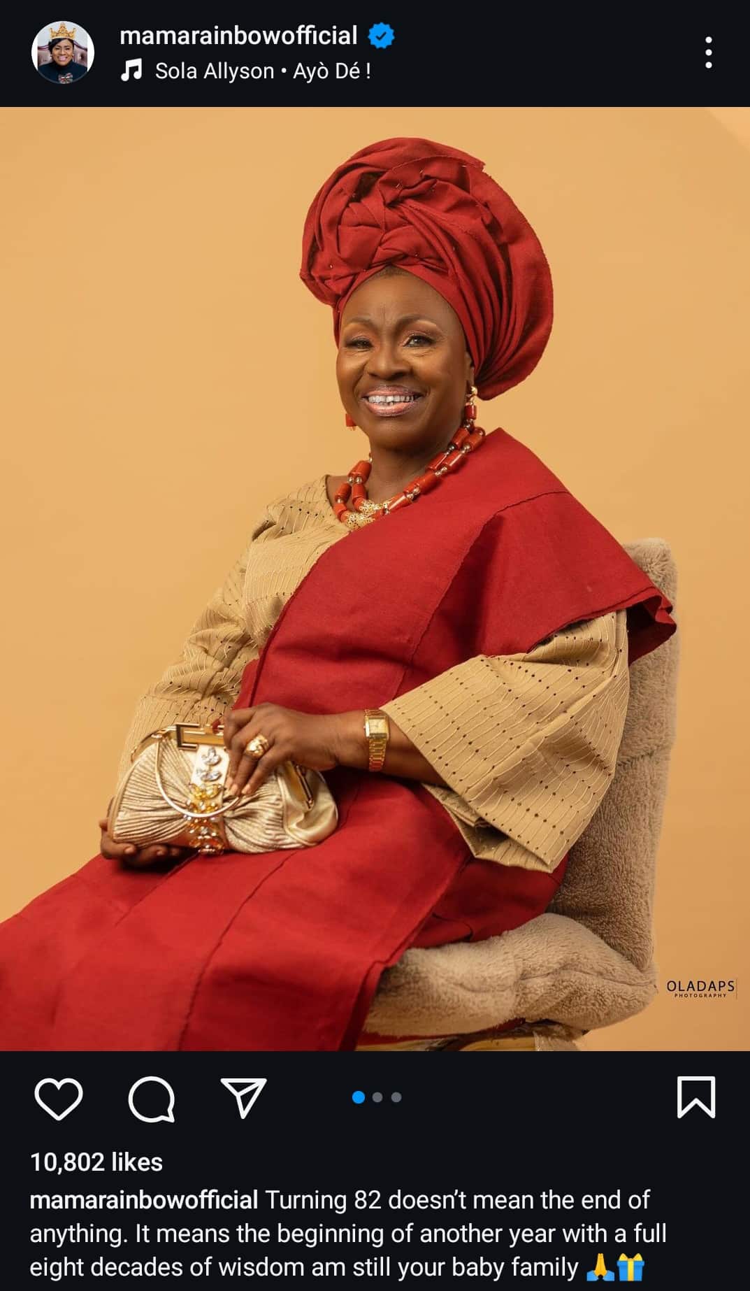 Nigerian actress Idowu Philips, popularly known as Mama Rainbow, has taken to social media to celebrate her 82nd birthday with a heartfelt message and a video.