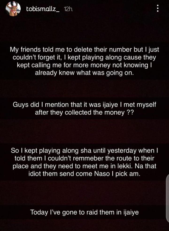 @tobismallz disclosed that she was in shock and depressed. However, she kept in touch with the preacher and his gang not knowing that they kept nudging her to bring in more money and this led to her meeting with the forerunner.