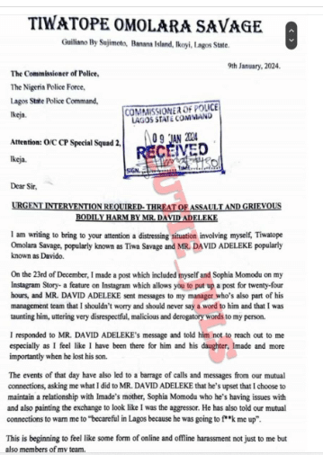 In the letter dated 9th of January, Tiwa Savage revealed that the singer sent derogatory, malicious, and threatening messages to her after she posted photos she took with Sophia Momodu, Davido’s baby mama.