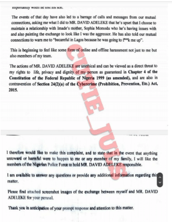 connections, asking me what I did to MR. DAVID ADELEKE that he’s upset that I chose to maintain a relationship with Imade’s mother, Sophia Momodu who he’s having issues with.