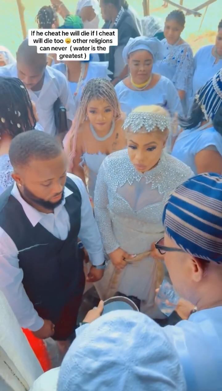 A marine worshipper, popularly known as Queen of Wealth, has gone viral after sharing videos of her “water wedding” with her Christian husband.