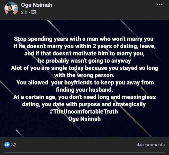According to a lady identified as Oge Nsimah on Facebook who declared that the ‘uncomfortable truth’ is that women shouldn’t stay in a relationship longer than two years.