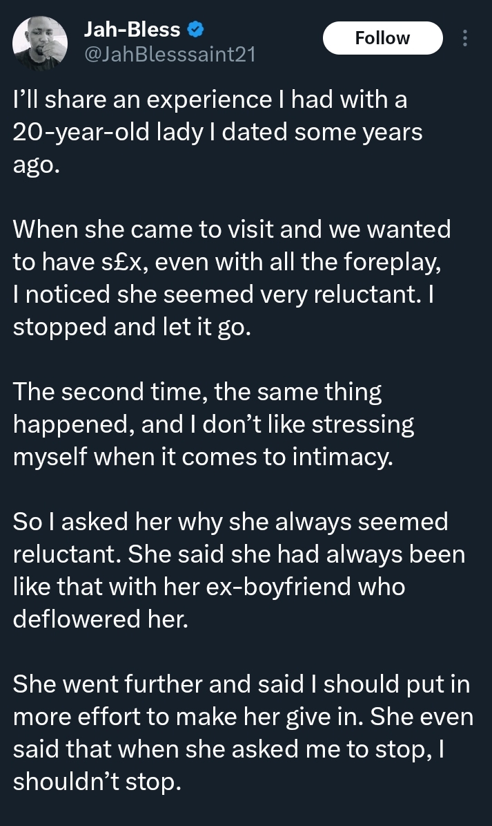 A Nigerian man has shared a personal relationship experience on social media, sparking conversations around consent and boundaries in modern dating.