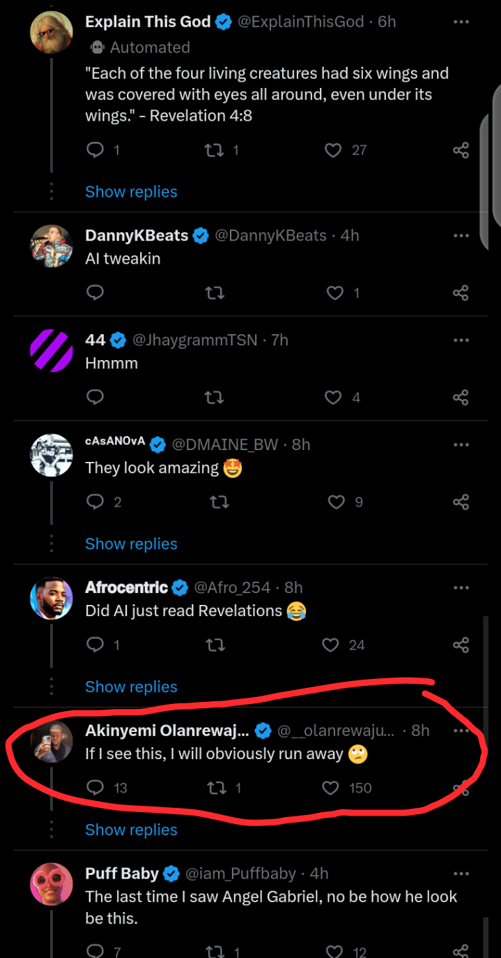 One of his followers named Akinyemi wrote “If I see this, I will obviously run away.”