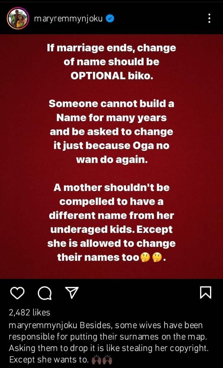 In her words: “If marriage ends, change of name should be optional Biko. Someone cannot build a Name for many years and he asked to change it just because Oga no wan do again.