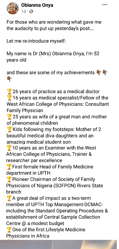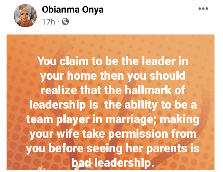 A 52-year-old Nigerian doctor and mother of three, Dr. Obianma Onyia, has caused a buzz online by criticizing the concept of wives seeking permission from their husbands to visit their parents.