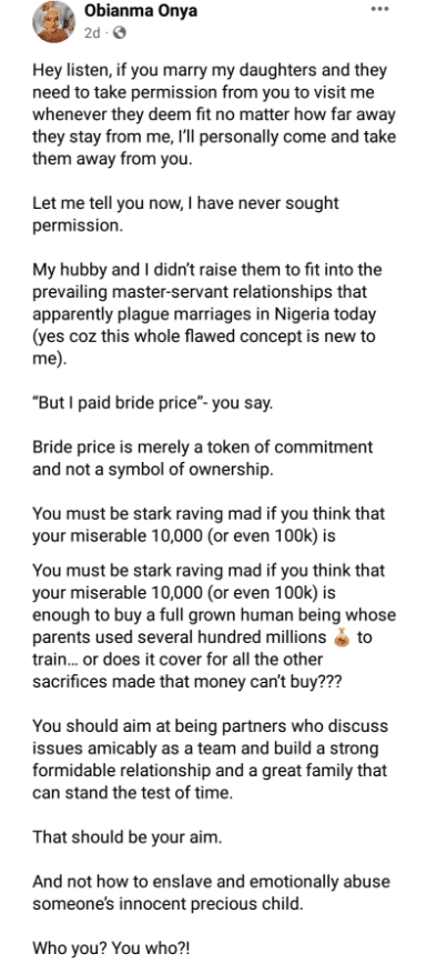 Dr. Onyia addressed her prospective sons-in-law, warning that if her daughters were required to seek permission from their husbands to visit her, she would personally intervene and remove them from such marriages.
