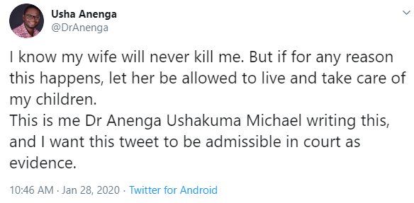 ”I know my wife will never kill me. But if for any reason this happens, let her be allowed to live and take care of my children. This is me Dr Anenga Ushakuma Michael writing this, and I want this tweet to be admissible in court as evidence” he wrote.