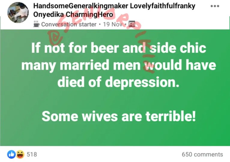 “If not for beer and side chic many married men would have died of depression. Some wives are terrible!”.