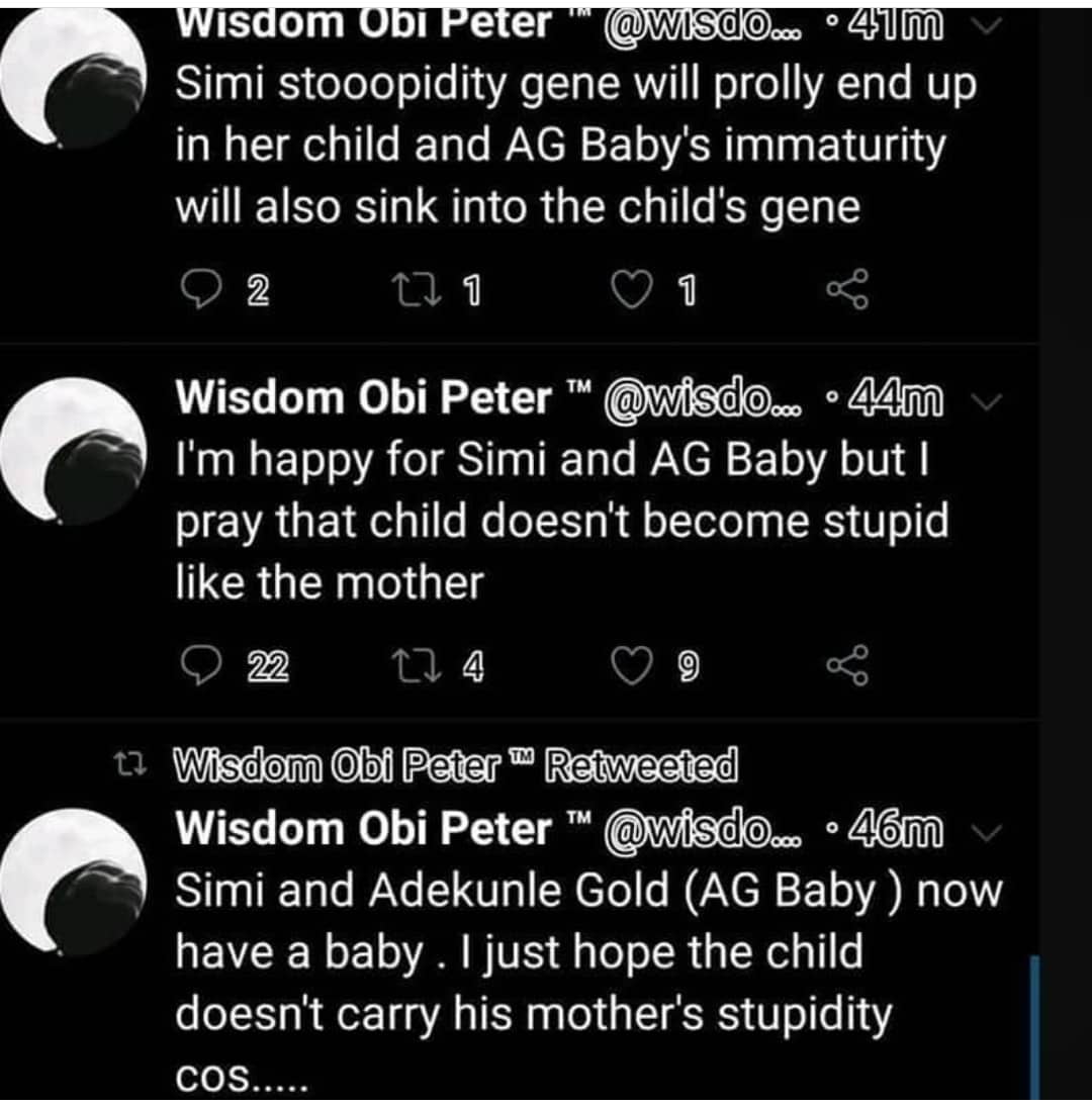 Nigerian man identified as Wisdom Obi Peter has taken to twitter to throw shades at popular singer, Simi and her baby girl, Adejare.