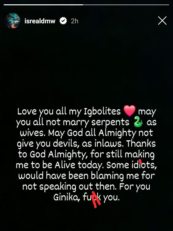 “Love you all my Igbolites may you all not marry serpents as wives. May God all almighty not give you devils, as inlaws. Thanks to God Almighty, for still making me to be Alive today. Some idiots, would have been blaming me for not speaking out then. For you Ginika, Fun.k YOU.”