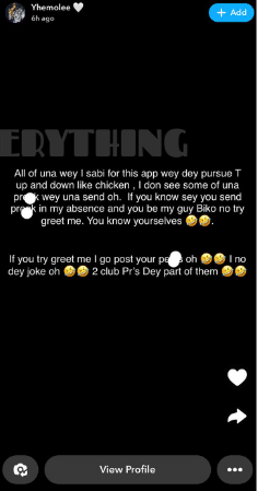 “All of una wey I sabi for this app wey dey pursue T up and down like chicken , I don see some of una prk wey una send oh. If you know sey you send prk in my absence and you be my guy Biko no try greet me. You know yourselves.