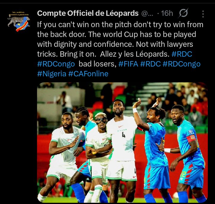 Via its official X page, FECOFA blasted Nigeria, calling them “bad losers” who couldn’t qualify for the 2026 FIFA World Cup on merit and were now trying to use legal tricks to get in.
