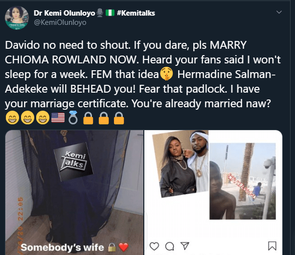 In a Twitter post, the journalist shared a picture of an unknown woman with the caption, “Davido no need to shout. If you dare, pls MARRY CHIOMA ROWLAND NOW. Heard your fans said I won’t sleep for a week.