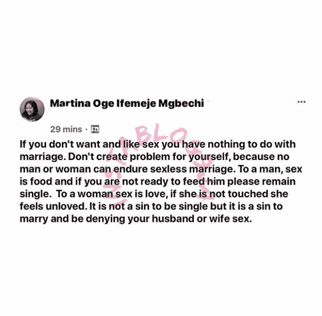 A Nigerian lady, Martina Oge Ifemeje Mgbechi on Facebook, has said that you don’t have anything to do with marriage if you don’t like or want sex.