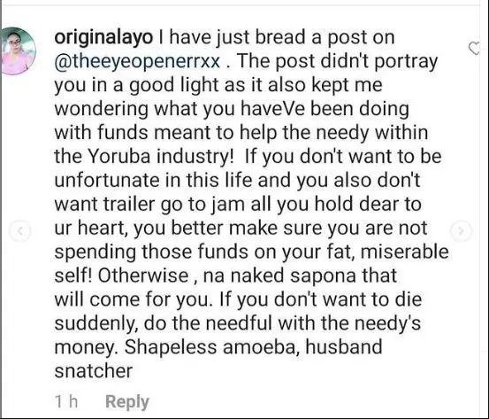 “I have just bread a post on the @theeyeopenerrxx. The post didn’t portray you in a good light as it also kept me wondering what you have been doing with funds meant to help the needy within the Yoruba industry! If you don’t want to be unfortunate in this life and you also don’t want trailer to jam all you hold dear to your heart, you better make sure you are not spending those funds on your fat, miserable self! Otherwise, na naked sapona that will come for you. If you don’t want to die suddenly, do the needful with the needy’s money. Shapeless amoeba, husband snatacher.”