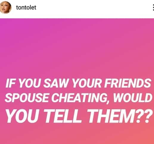 “If you see your friend’s spouse cheating, would you tell them?” – Tonto Dikeh asks