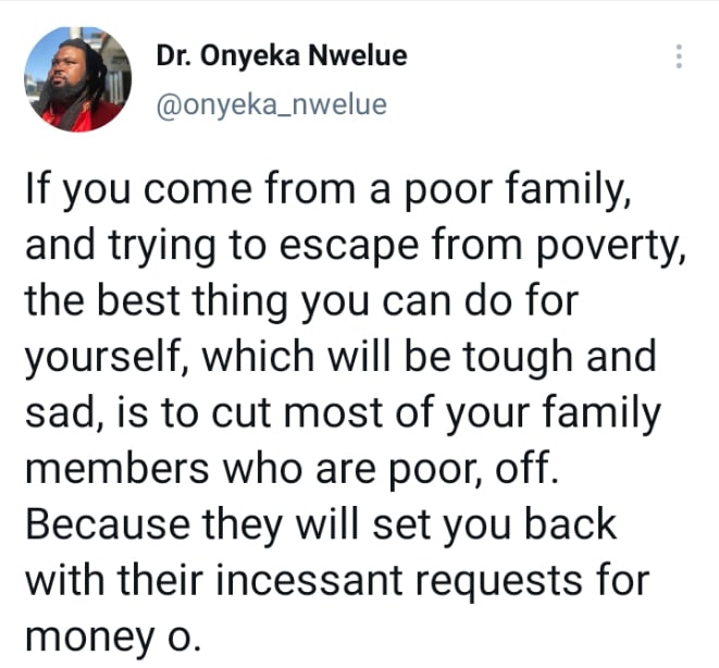“If you come from a poor family, and trying to escape from poverty, the best thing you can do for yourself, which will be tough and sad, is to cut most of your family members who are poor, off. Because they will set you back with their incessant requests for money o.”