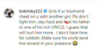 “Girls if ur boyfriend cheat on u with another girl. Pls don’t fight him, slay hard and f**k his father or one of his rich UNCLE. I guess that will hurt him more . I don’t have time for rubbish. Make sure his uncle send him errand in your presence”