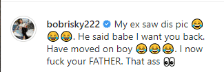 “My ex saw dis pic ???. He said babe I want you back. Have moved on boy ???. I now f**k your FATHER. That ass ?”