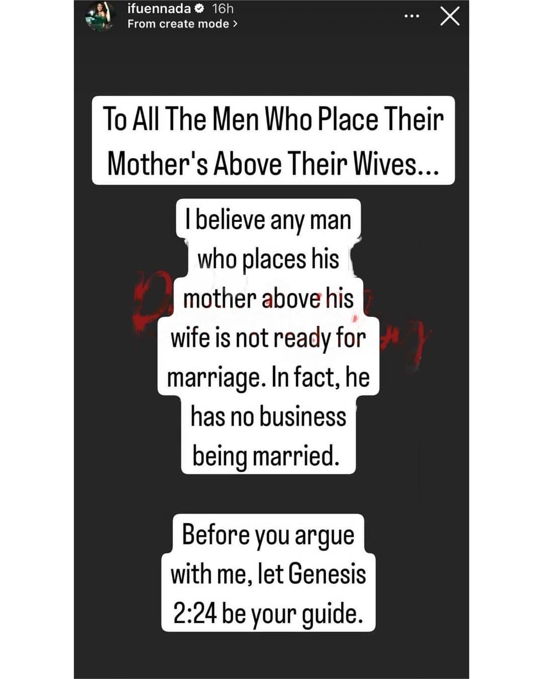 “To all the men who place their mothers above their wives. I believe any man who places his mother above his wife is not ready for marriage. In fact, he has no business being married. Before you argue with me, let Genesis 2.24 be your guide.”