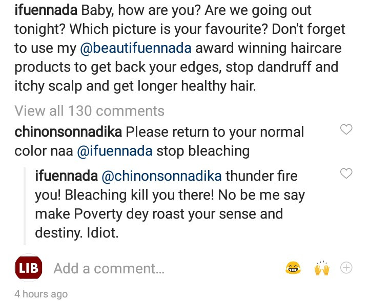 The follower wrote: “Please return to your normal color naa @ifuennada stop bleaching.”