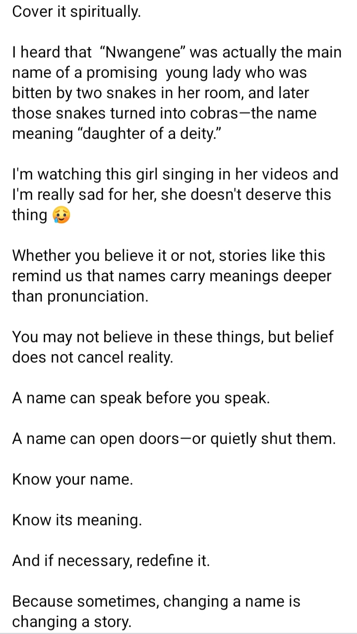 In a post, a lady identified as Amarachi E Eddy shared her thoughts on the late singer’s surname, Nwangene, focusing on its meaning and what she described as possible spiritual implications associated with names.