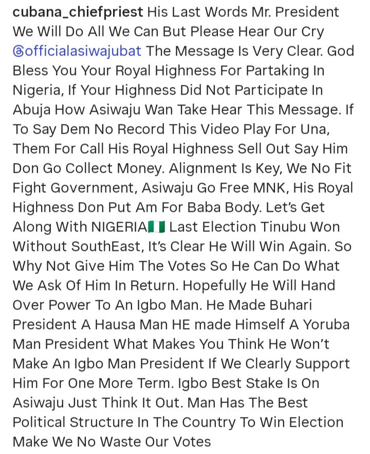 Reacting to a viral video in which a South-East traditional ruler urged the President to either release Kanu or return him to Kenya, Cubana Chief Priest commended the monarch for taking the appeal directly to Abuja.