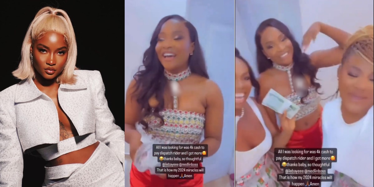 In the clip, the fashion designer Mimi Linda Yina, also known as Medlin boss, and another woman were hailing Ilebaye when she was holding onto a large pile of cash, from which she took out a large amount for each of them.
