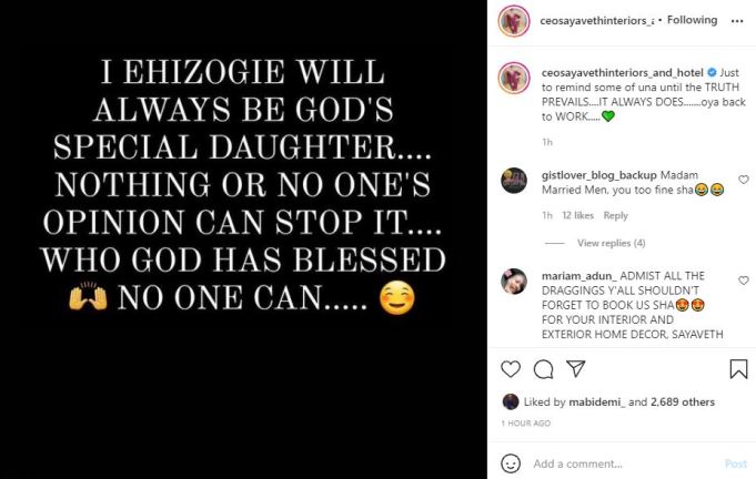“I EHIGOZIE WILL ALWAYS BE GOD’S SPECIAL DAUGHTER… NOTHING OR NO ONE’S OPINION CAN STOP IT… WHO GOD HAS BLESSED ? NO ONE CAN…..”