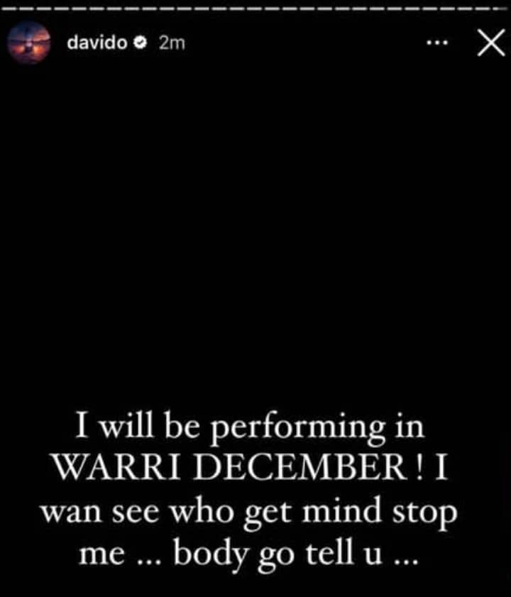 In a fresh post, Davido has revealed that he will be performing in Warri in December.