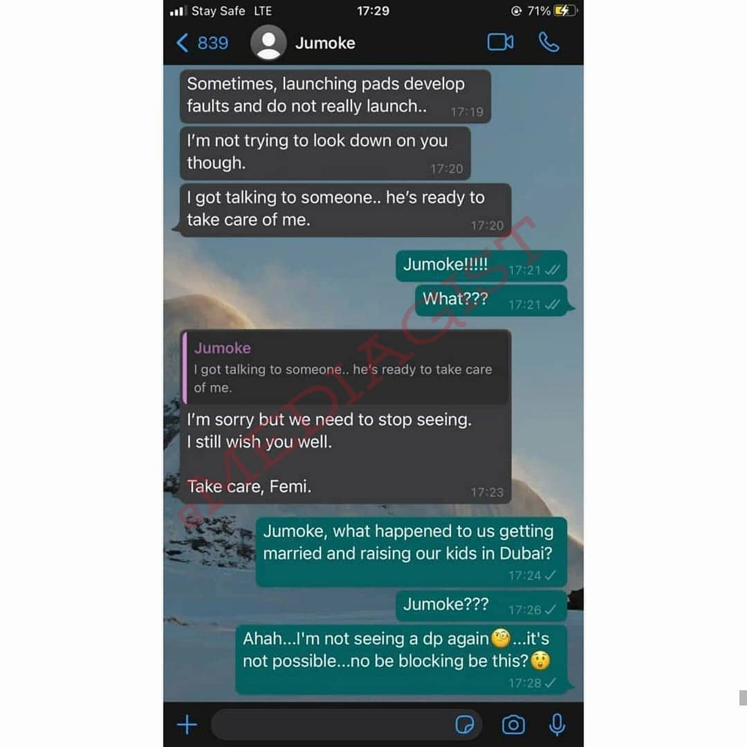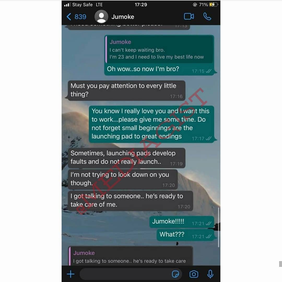 In the conversation shared, the lady complained about being young and not enjoying herself due to lack of finance. She told her boyfriend, Femi that she has already linked up with another man who is presently taking good care of her.